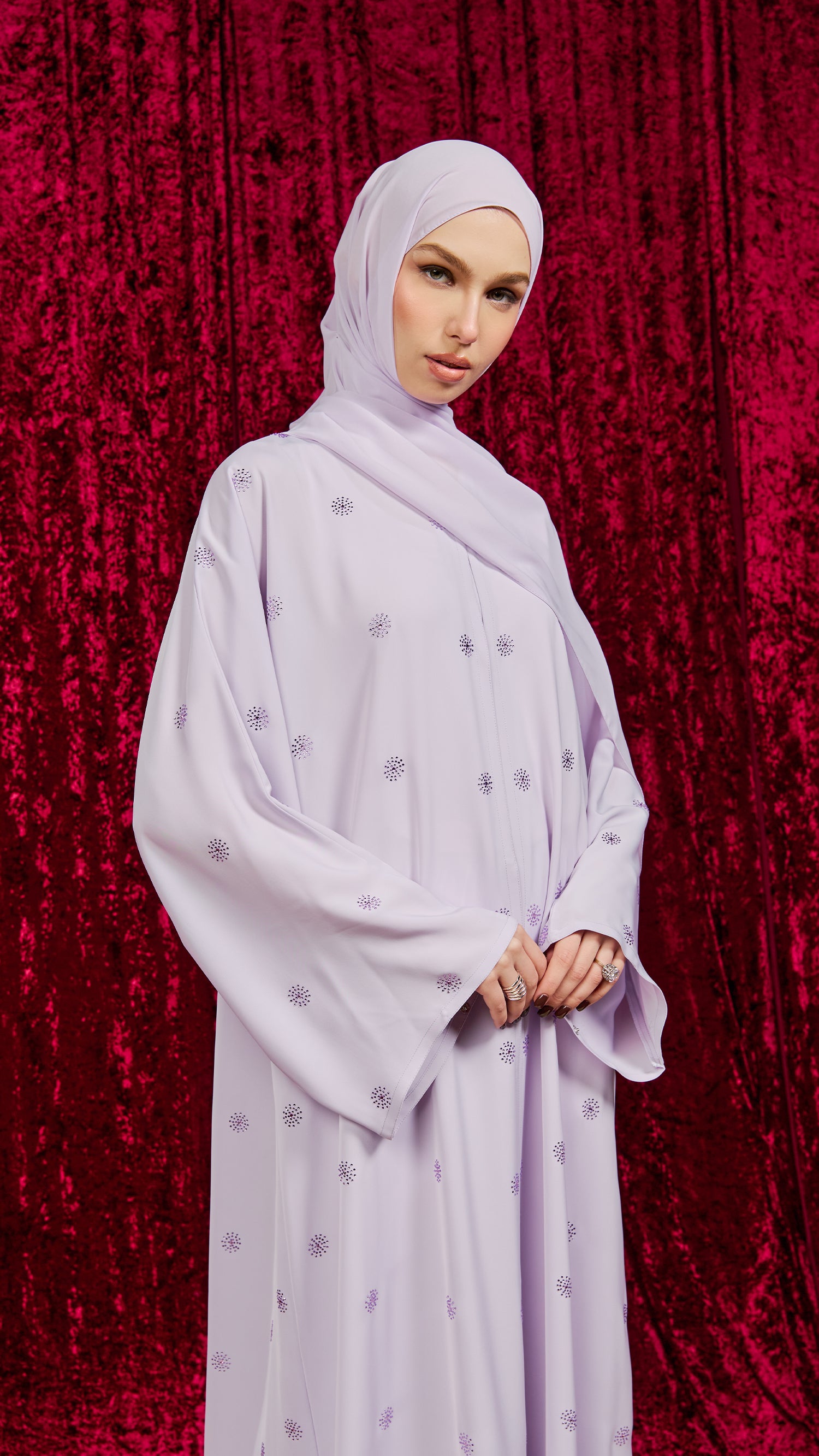 Aleppo is a refined abaya designed with a delicate pattern of small, scattered starburst-like embellishments. These tiny rhinestones are distributed randomly across the fabric front and back, adding texture and a subtle sparkle. The look is completed with a subtle rhinestones on the sleeves, giving the garment an elegant, luxurious finish.