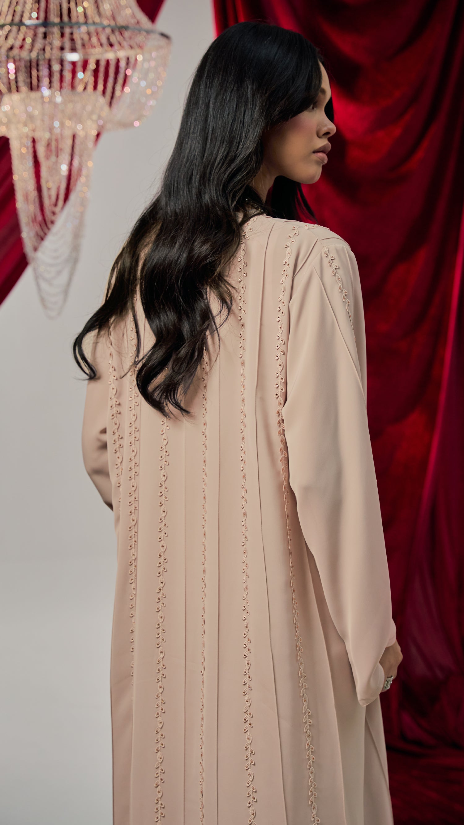 The Elfani abaya features a delicate embroidered leafy trail with rhinestones running vertically down the front and on the sleeves, adding a subtle shimmer. Its clean, elegant lines enhance the modest silhouette, making it perfect for special occasions.