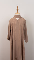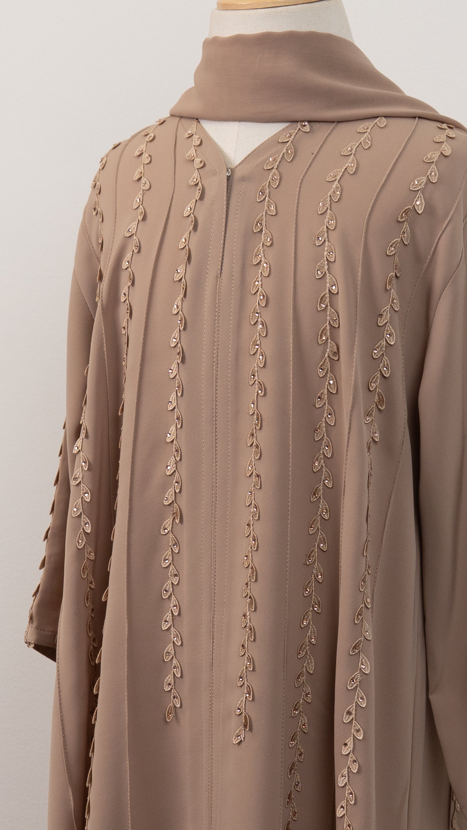 The Elfani abaya features a delicate embroidered leafy trail with rhinestones running vertically down the front and on the sleeves, adding a subtle shimmer. Its clean, elegant lines enhance the modest silhouette, making it perfect for special occasions.