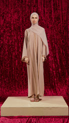 Sanliurfa Abaya is crafted with a delicate decorative design featuring an intricate woven braid that runs vertically down the center front, outlines the V-neckline, and accents the sleeve cuffs. Small rhinestones are embedded along the braided trim, adding a subtle sparkle from top to bottom and across the sleeves. These motifs appear on both the front and back of the abaya, creating a harmonious, fully embellished look. The decorative braided trim frames the edges, while the garment drapes gracefully for comfort and modesty.