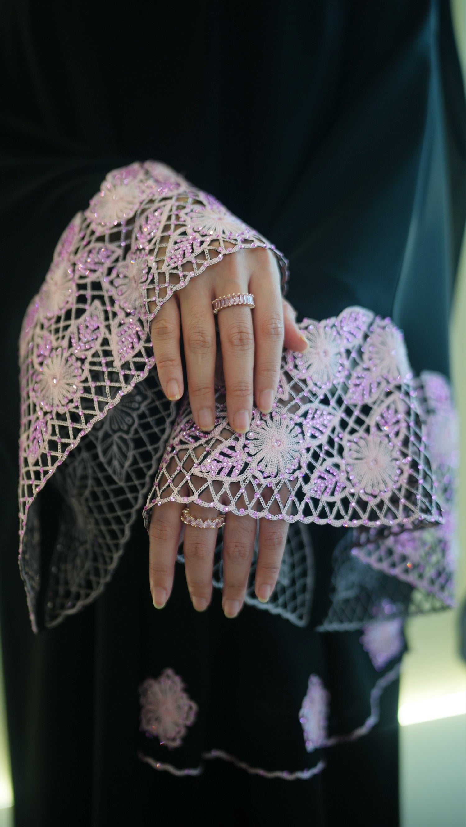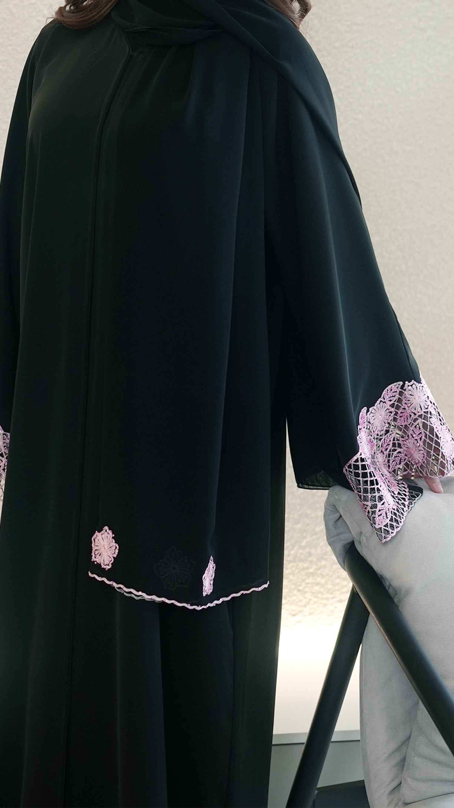 The laser-cut lace provides a subtle contrast to the black fabric, enhancing the abaya’s overall look with a modern and sophisticated flair