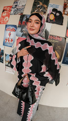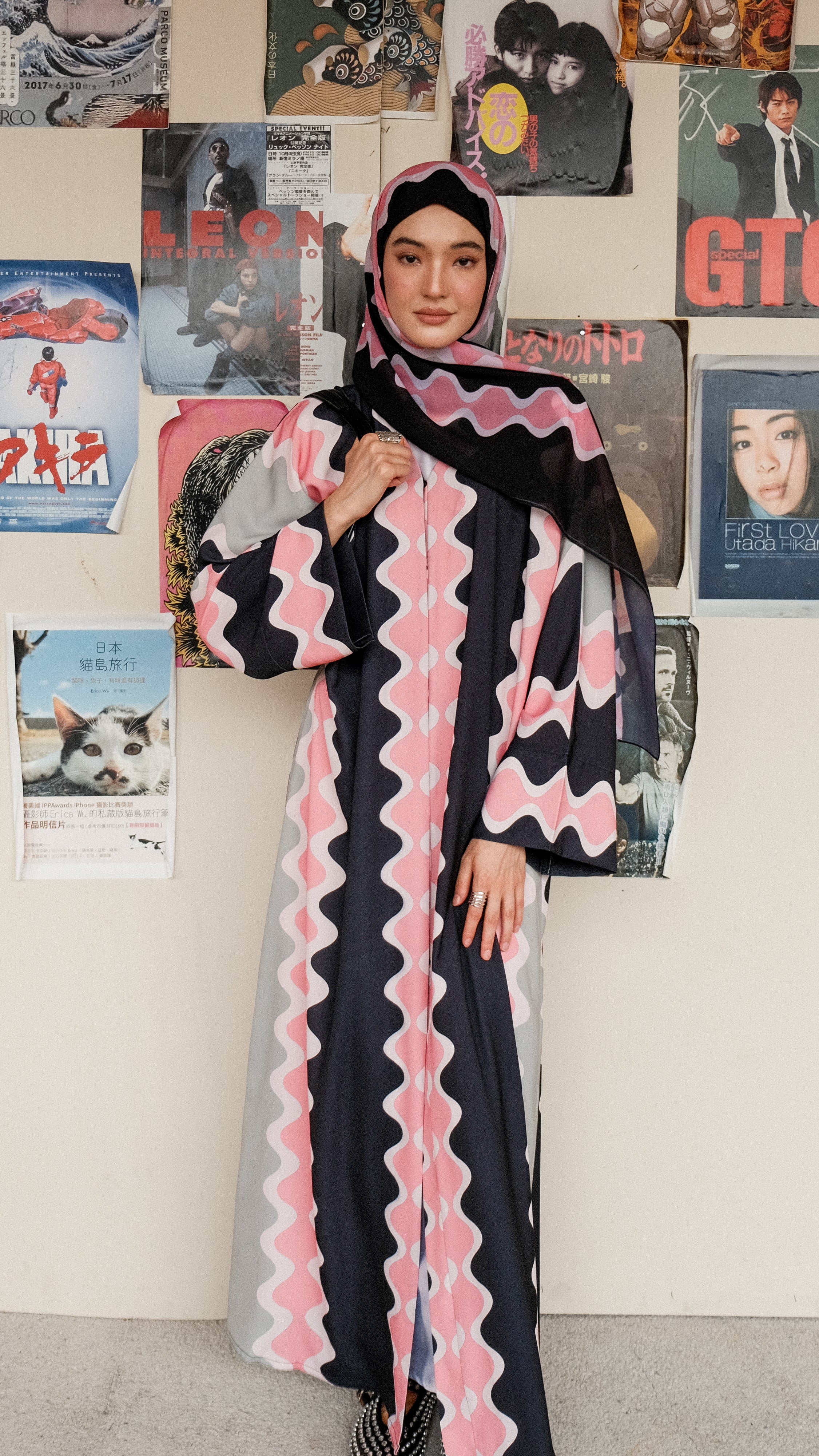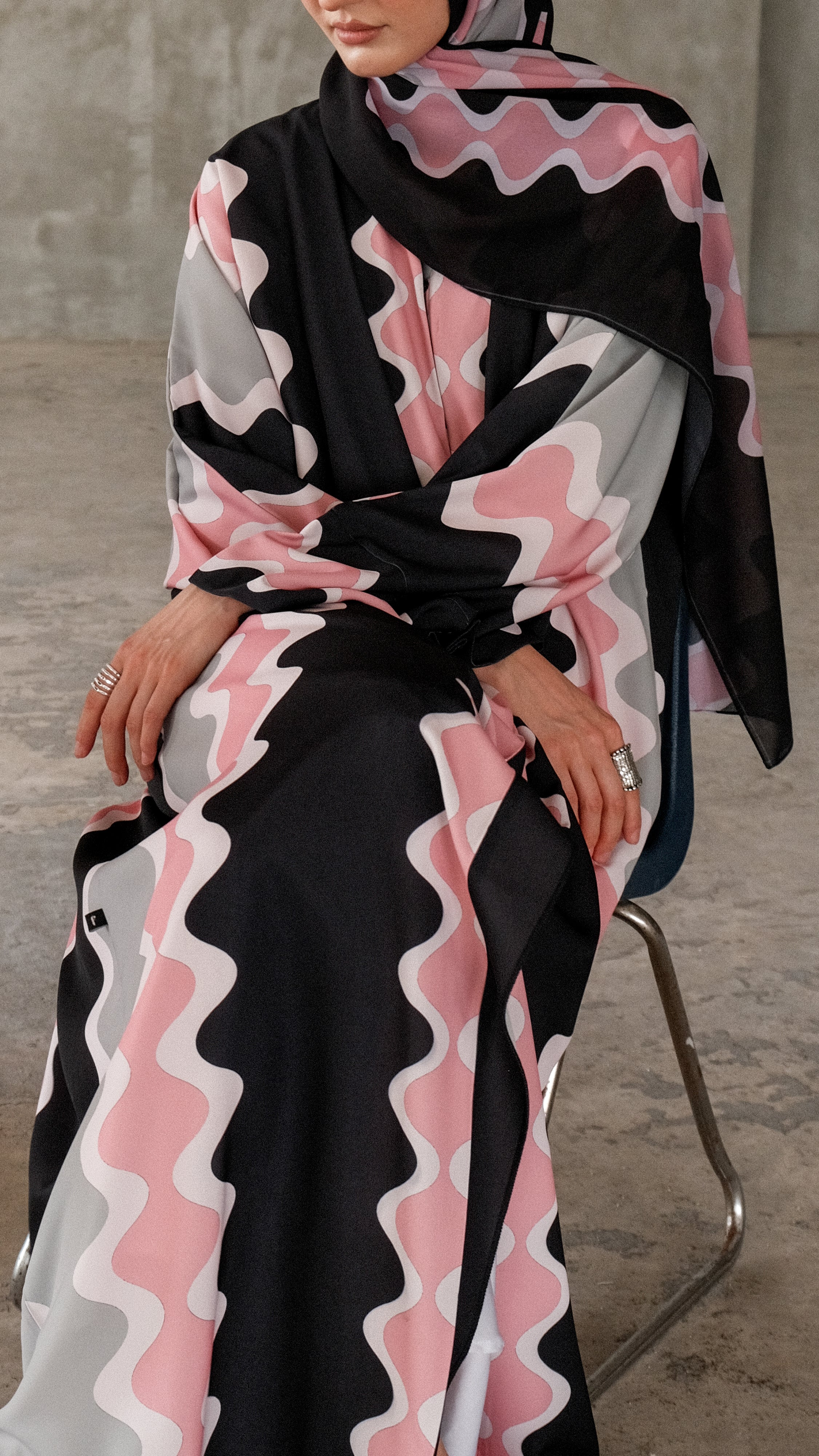Dhurma Abaya showcases a colourful abstract wave pattern running vertically, inspired by retro design, crafted from flowy, lightweight material.