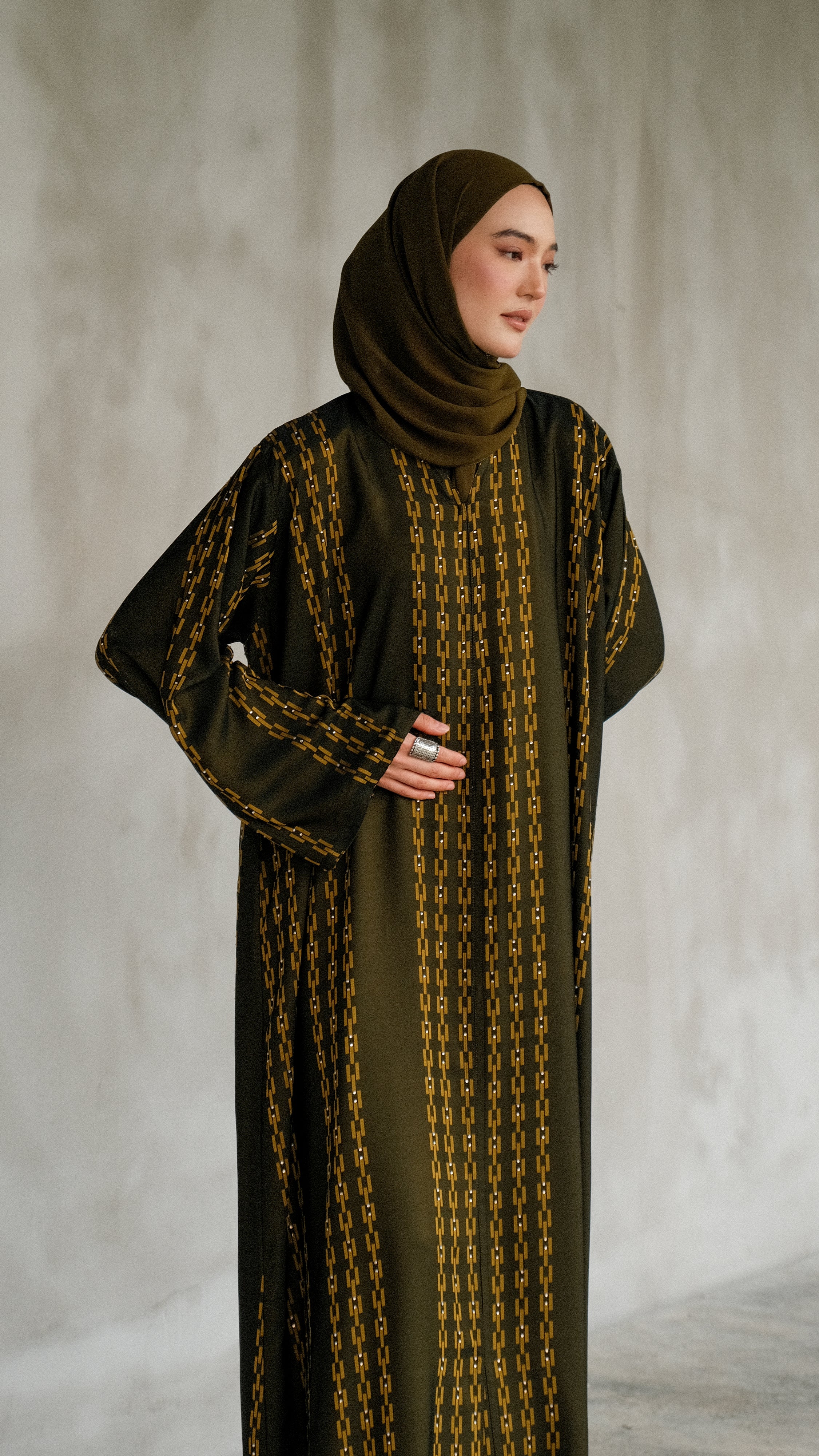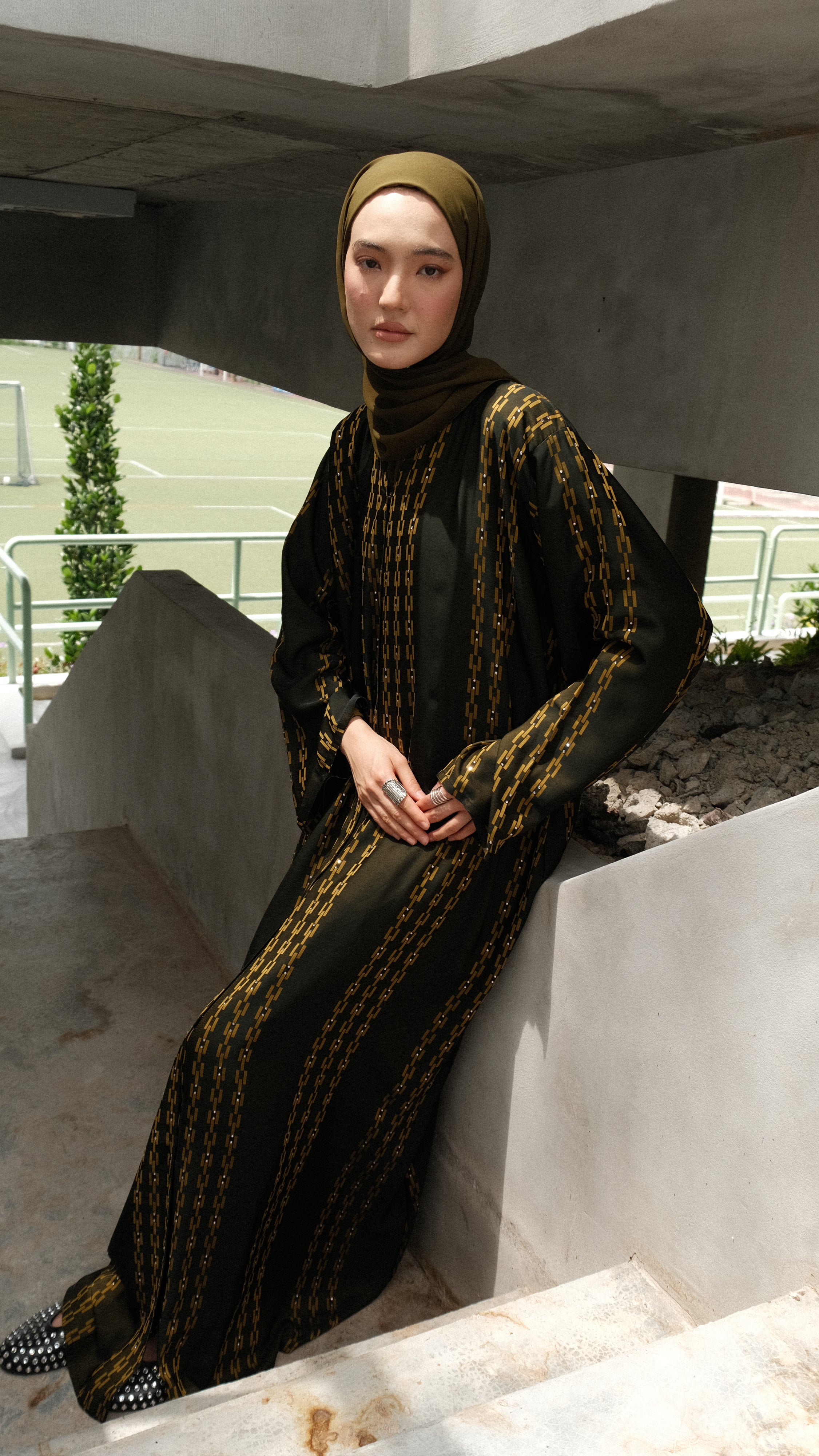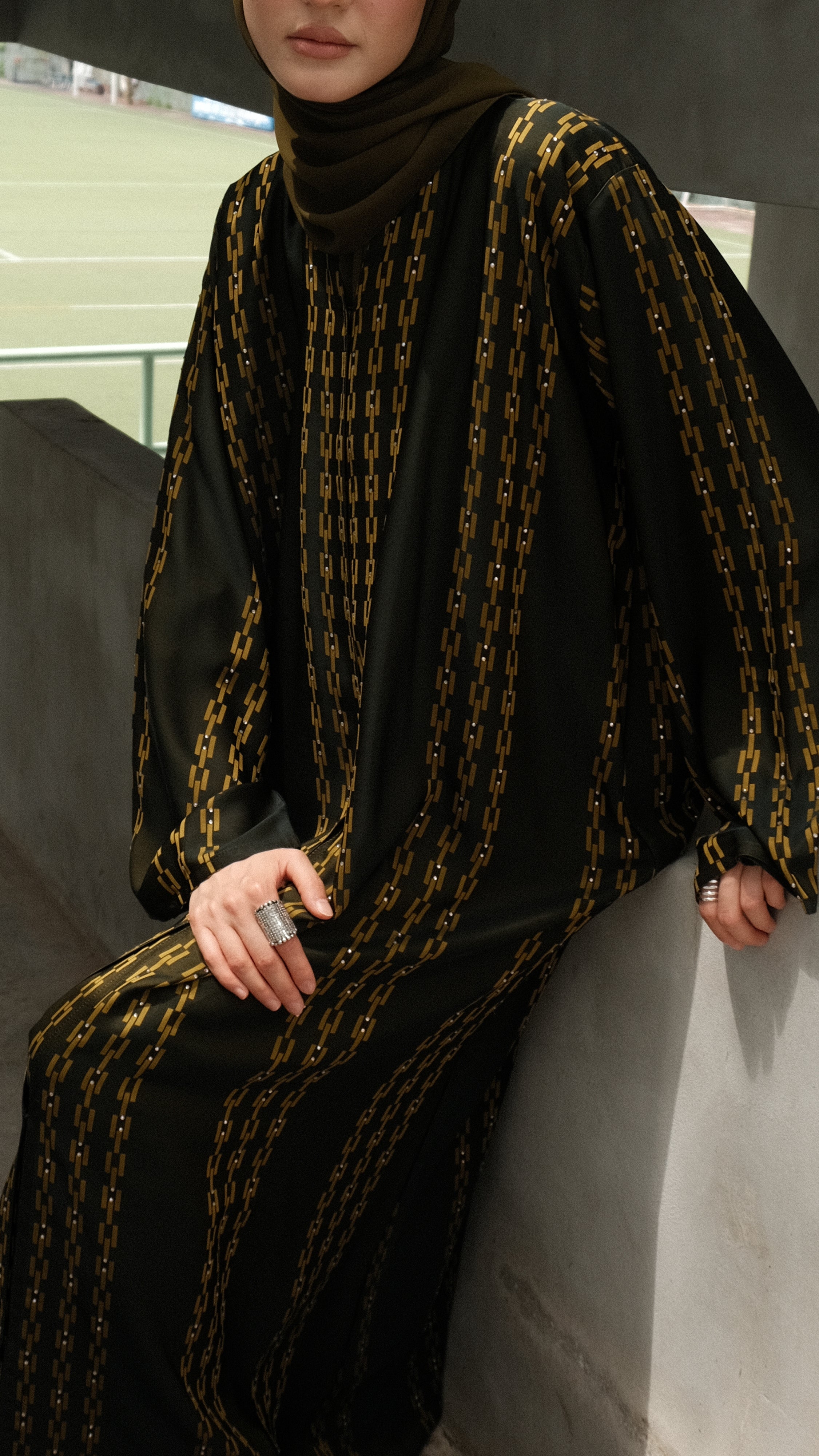 Jasra Abaya showcases a striking abstract print inspired by delicate yellow chain motifs, adorned with subtle rhinestone accents scattered gracefully across the fabric blending understated elegance with undeniable beauty.