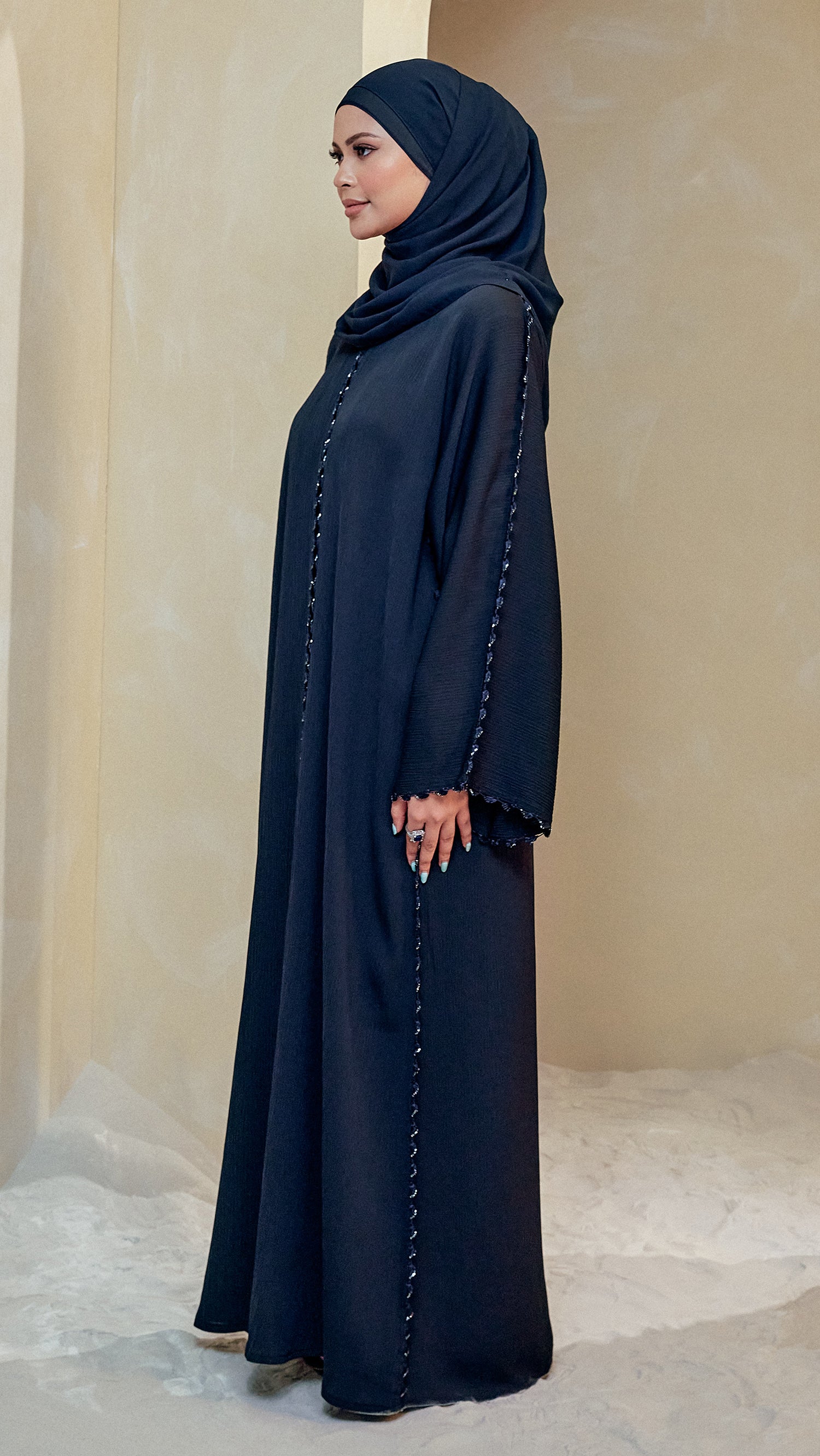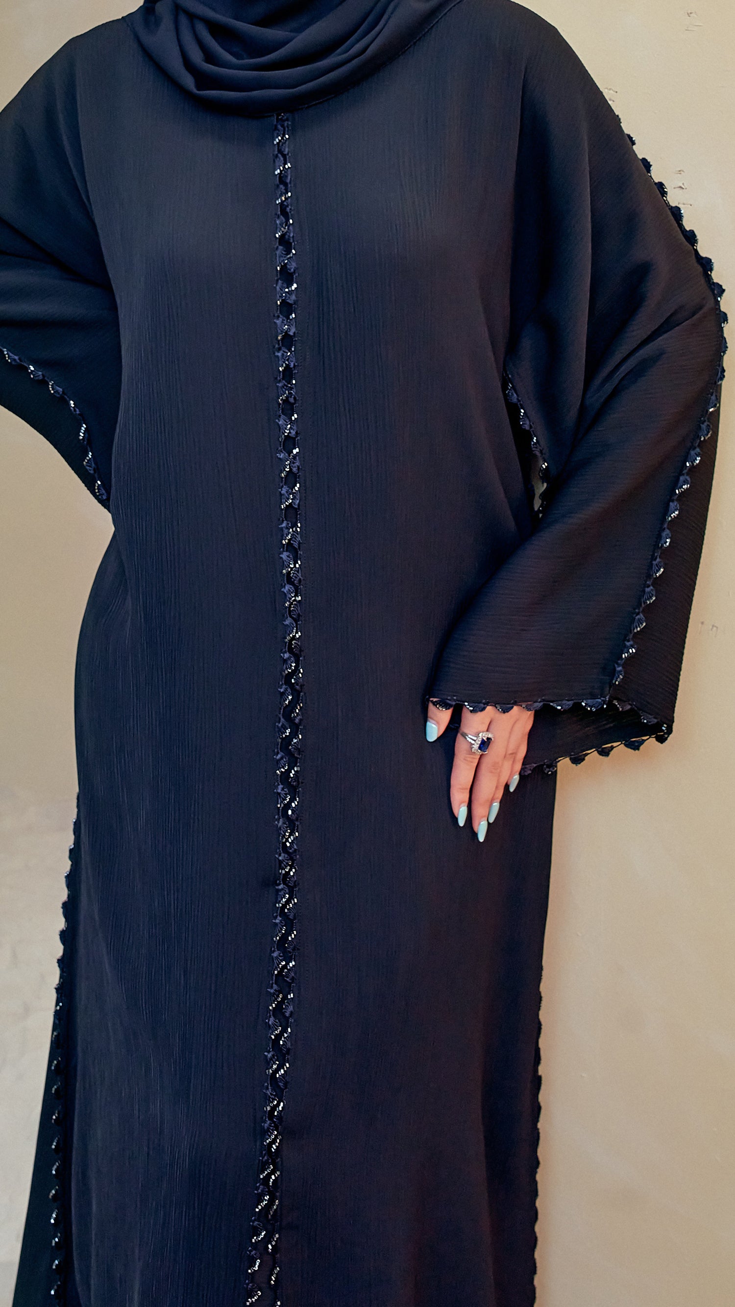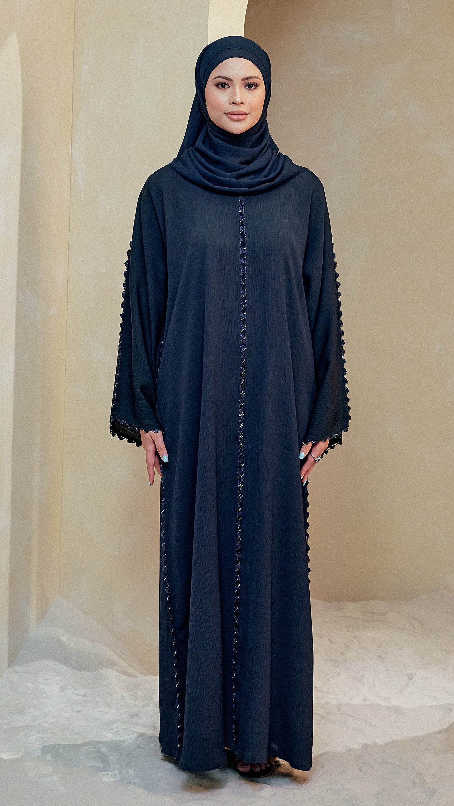 Notes: This abaya cannot be altered in terms of its body, front closure, or length due to its unique features and details.