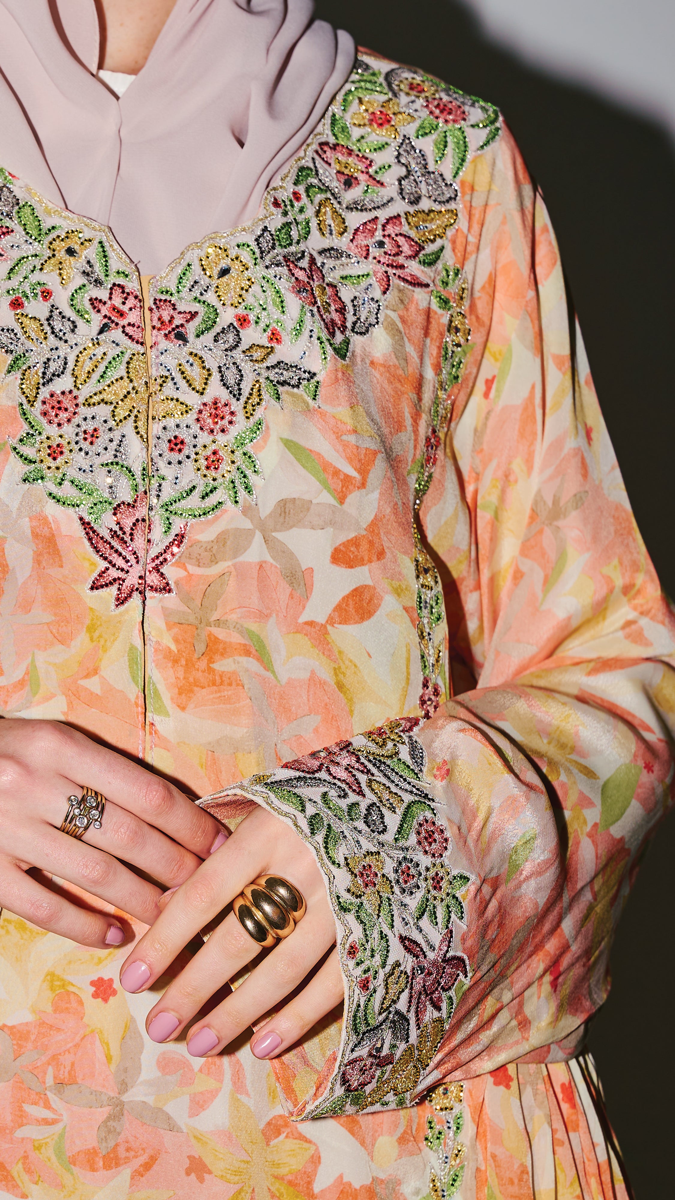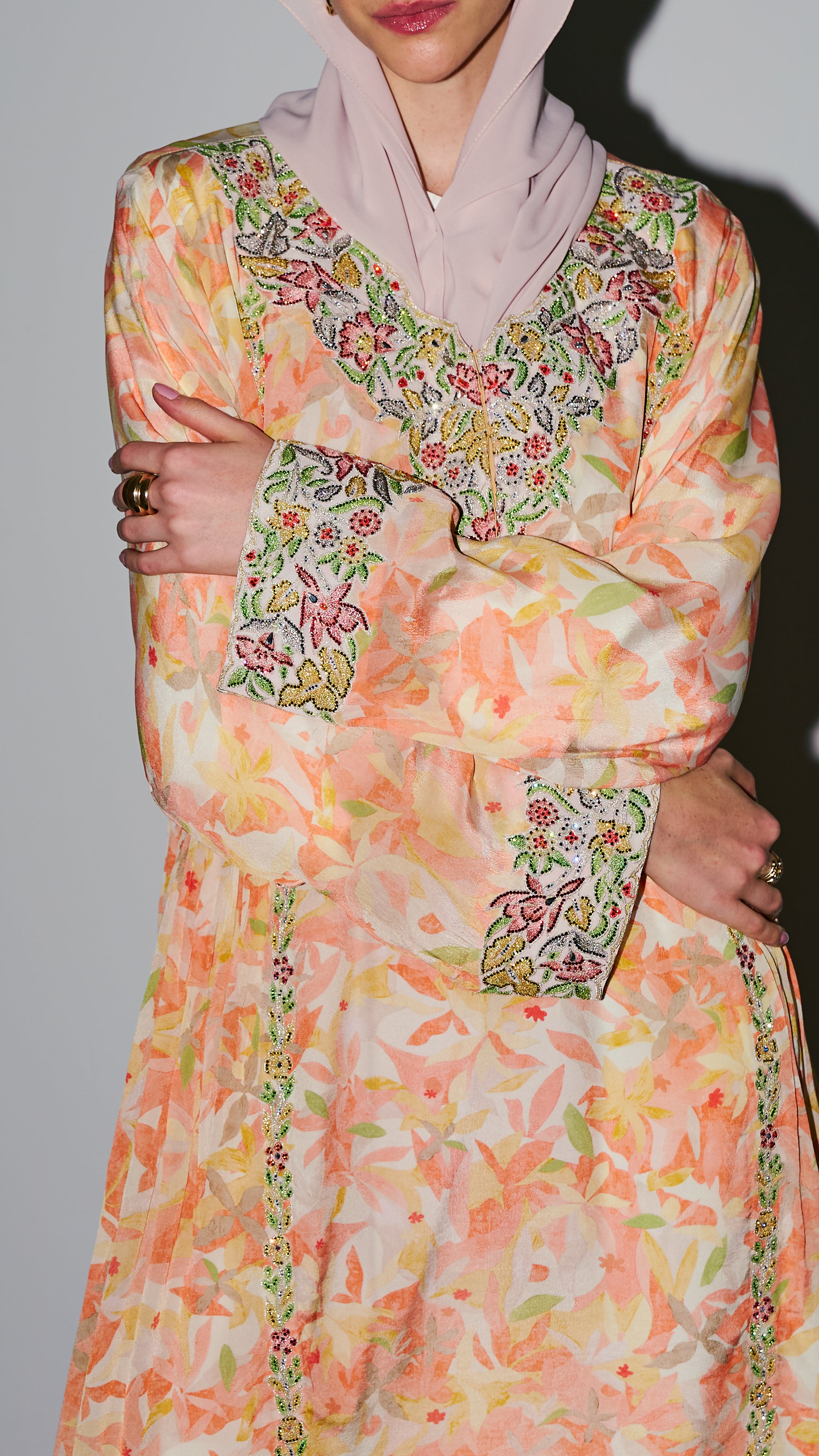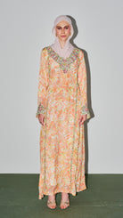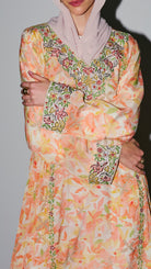 Jalabia - Light Orange Based with Floral Patterns & Rhinestones