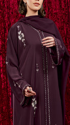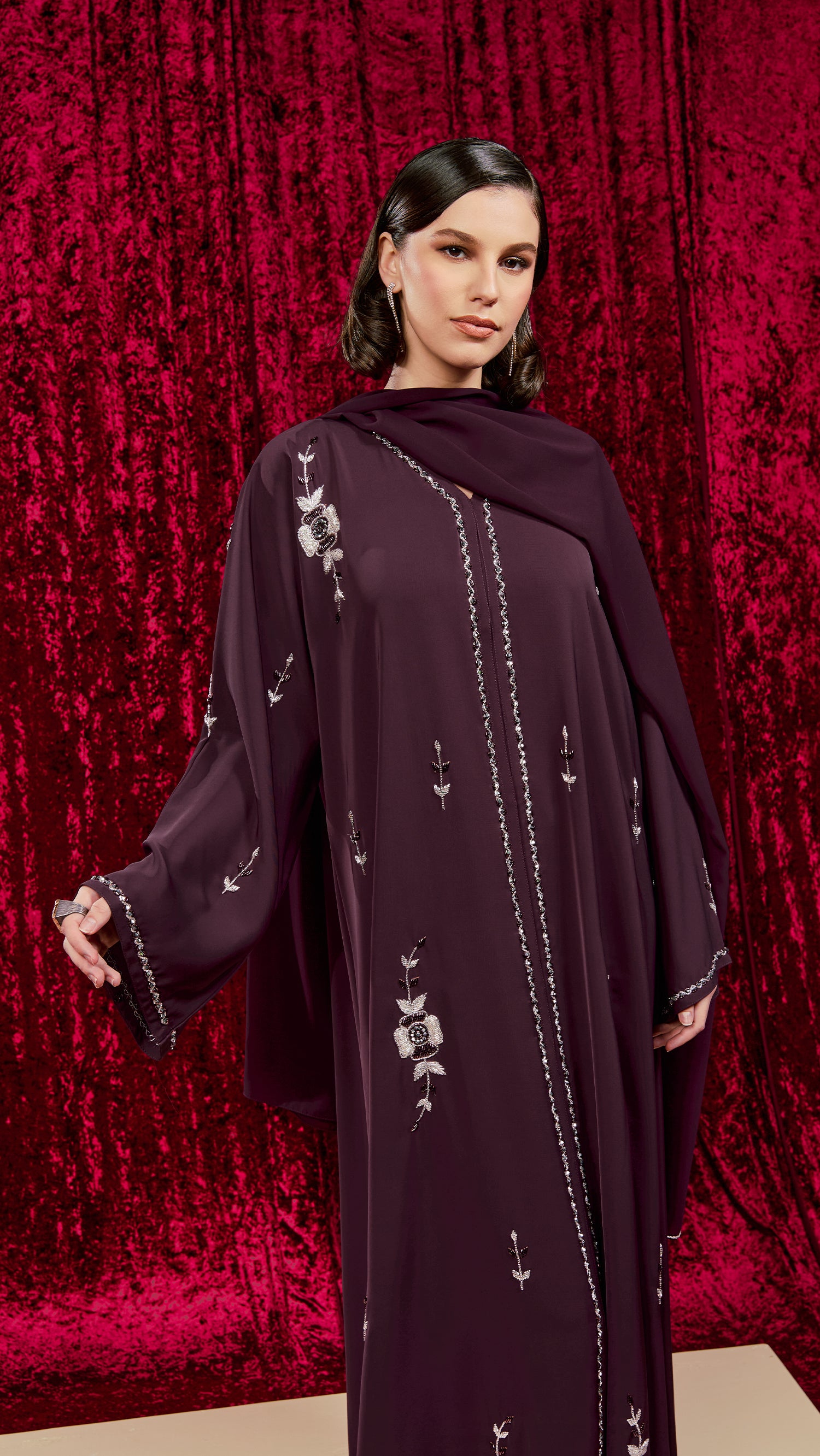 Our Asalem abaya features large floral and rosette-like embroideries on the chest and shoulders, with smaller sprigs filling the front panels. Beaded borders run along the front opening and V-neckline, while the sleeve cuffs are finished with beadings along the edges, creating a traditional, elegant, and graceful look.