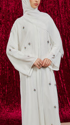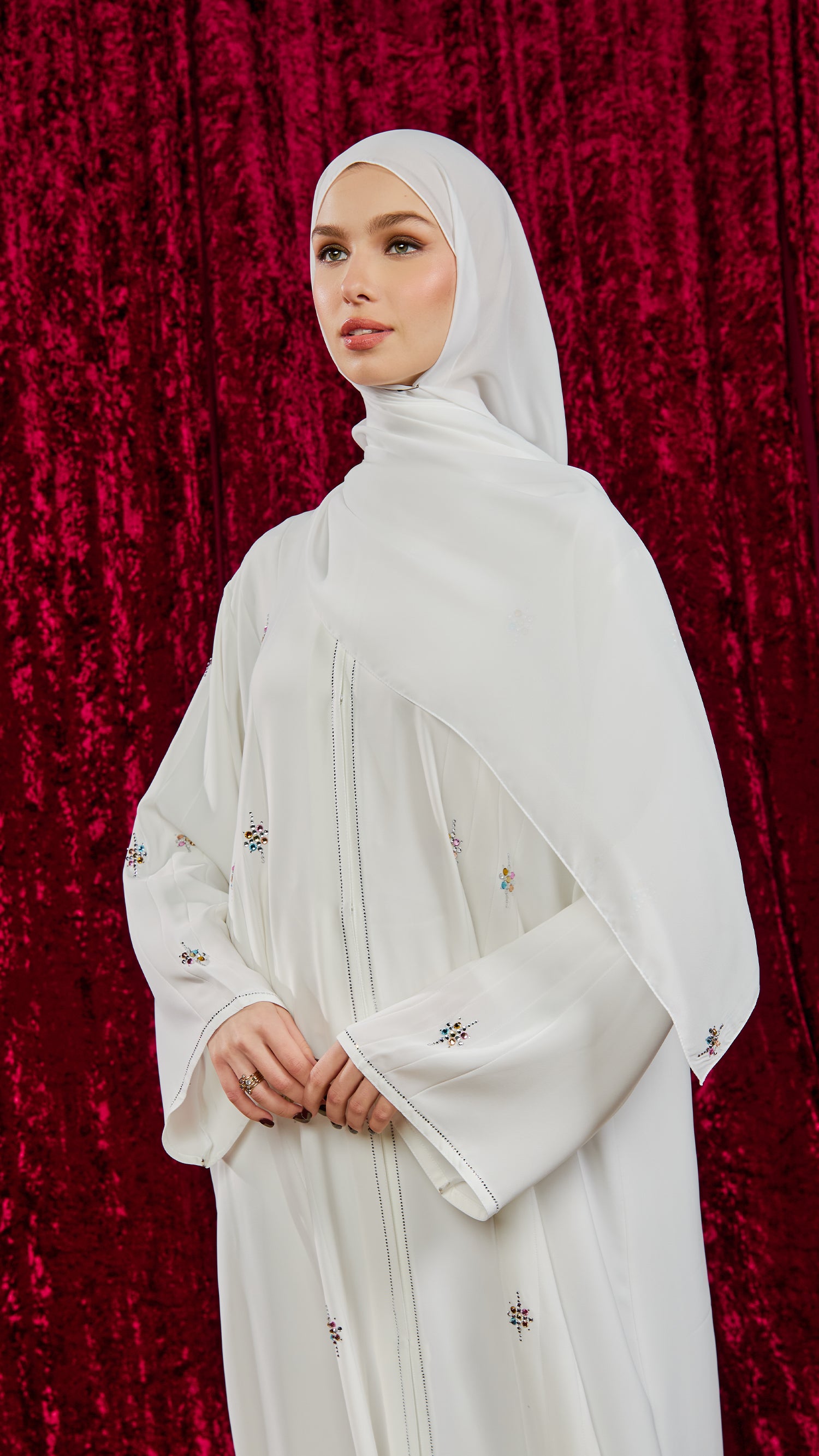 The Lali Abaya is a minimalist, refined design adorned with scattered multi-coloured crystal floral clusters that add a soft, delicate sparkle. Each tiny bloom-like embellishment is evenly spaced across the front and sleeves for an airy, graceful look. A fine crystal trim traces the neckline and front opening, creating a clean, elegant outline, while subtle vertical pleats in the base fabric add gentle texture. Finished with a small rhinestone accent at each sleeve end, it offers effortless, everyday elegance.