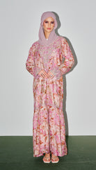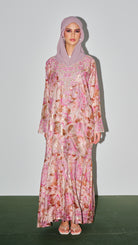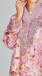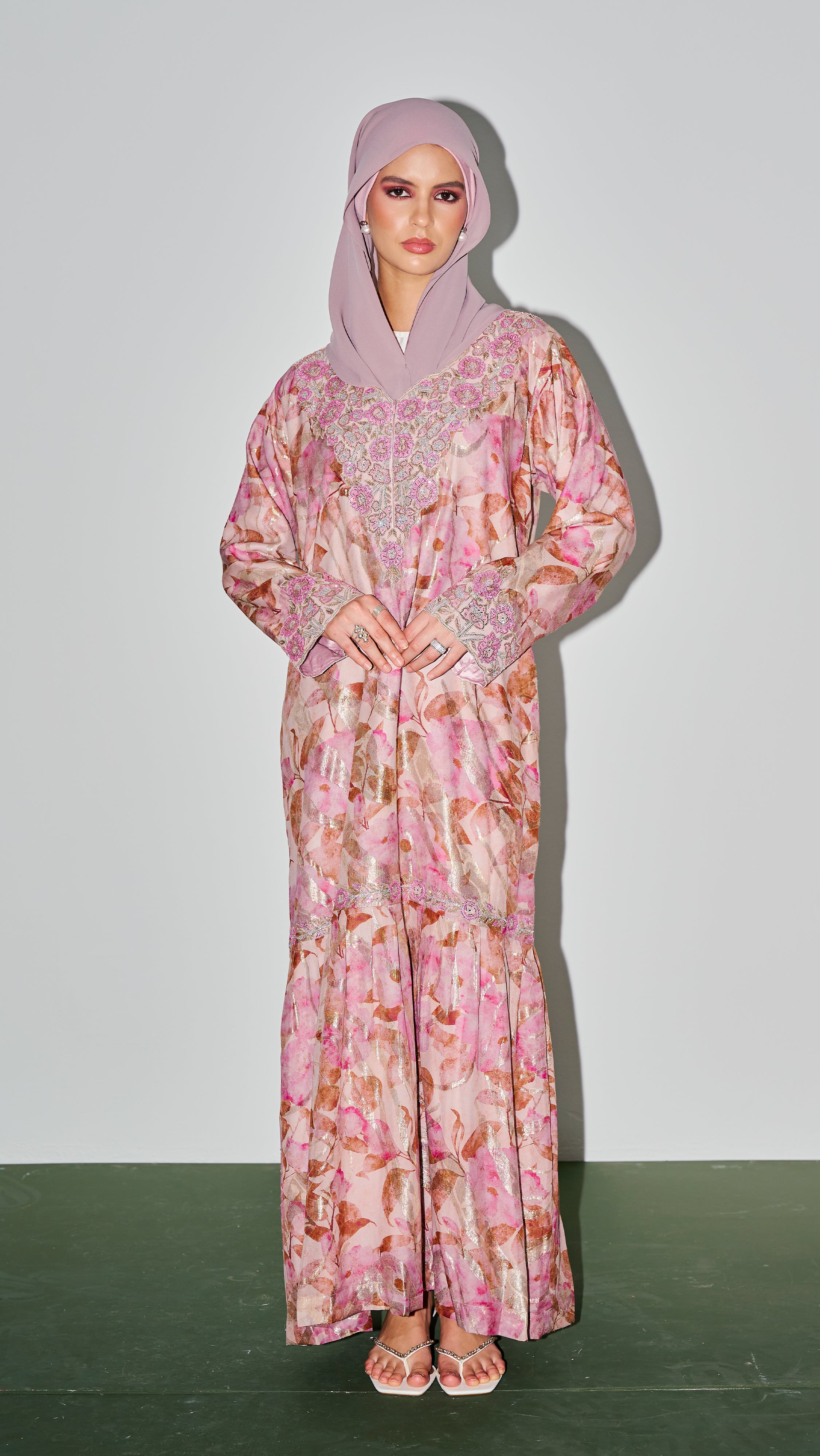 Jalabiya - Dusty Pink Based with Gold and Pink Floral Patterns & Rhinestones