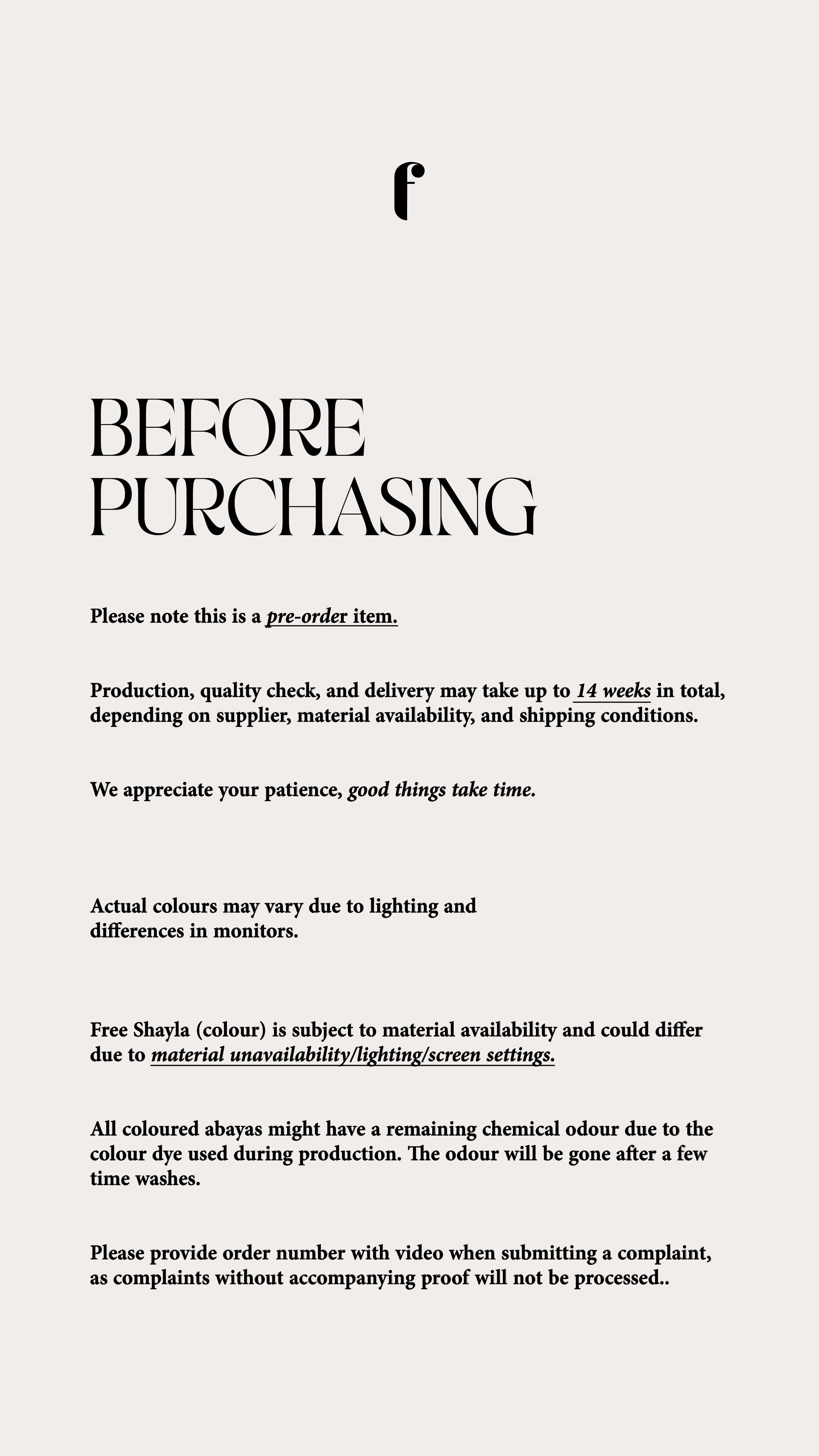 Introducing the Reyhanli abaya, a masterpiece made from Rosed Crepe that offers both comfort and style. The fabric's slight stretch and captivating silver dust effect create a refined look. The geometric embroidery along the border adds a modern touch, while the unique sleeve slit sets it apart. Perfect for any occasion, this abaya combines style and comfort effortlessly.