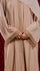 Sanliurfa Abaya is crafted with a delicate decorative design featuring an intricate woven braid that runs vertically down the center front, outlines the V-neckline, and accents the sleeve cuffs. Small rhinestones are embedded along the braided trim, adding a subtle sparkle from top to bottom and across the sleeves. These motifs appear on both the front and back of the abaya, creating a harmonious, fully embellished look. The decorative braided trim frames the edges, while the garment drapes gracefully for comfort and modesty.