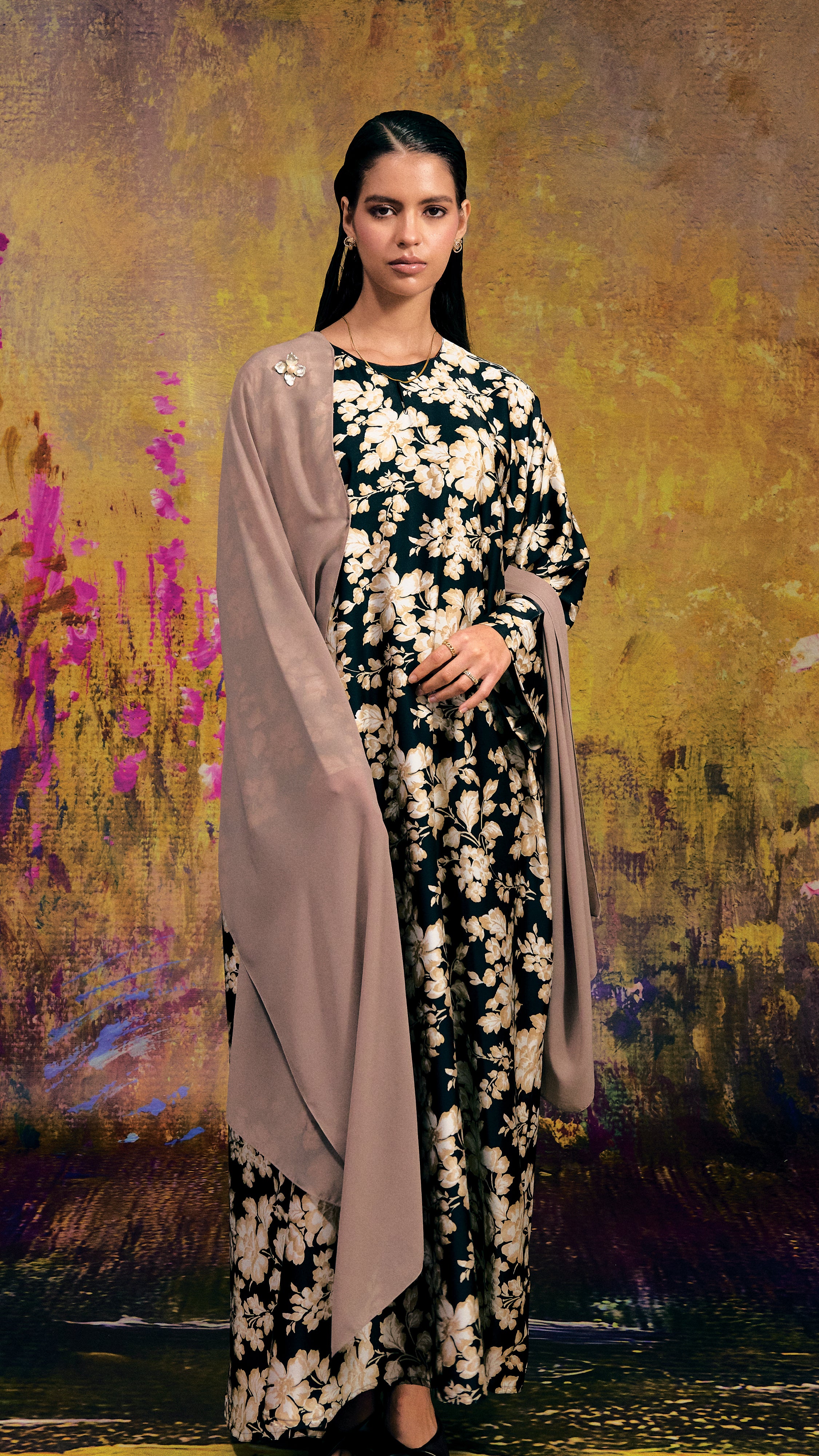 The Kagiza Floral Cream blends dress-like elegance with soft satin, adorned with cream and gold-accented floral details on a black base perfect for summer comfort and style.