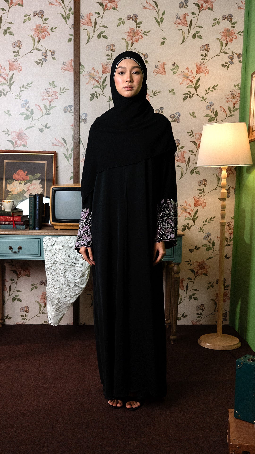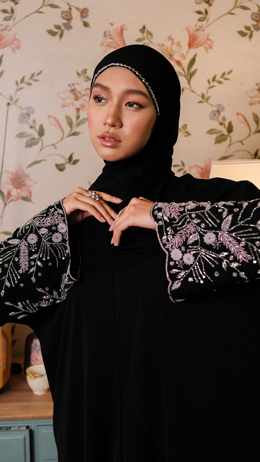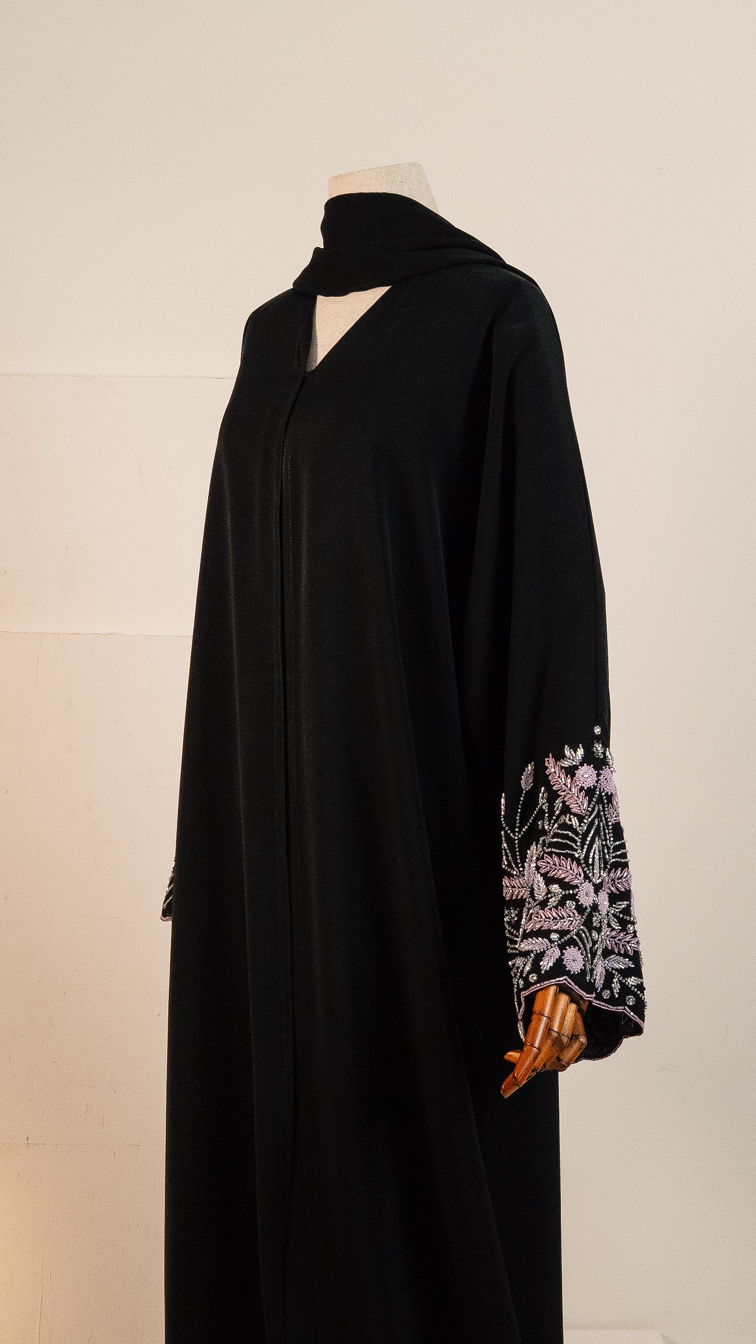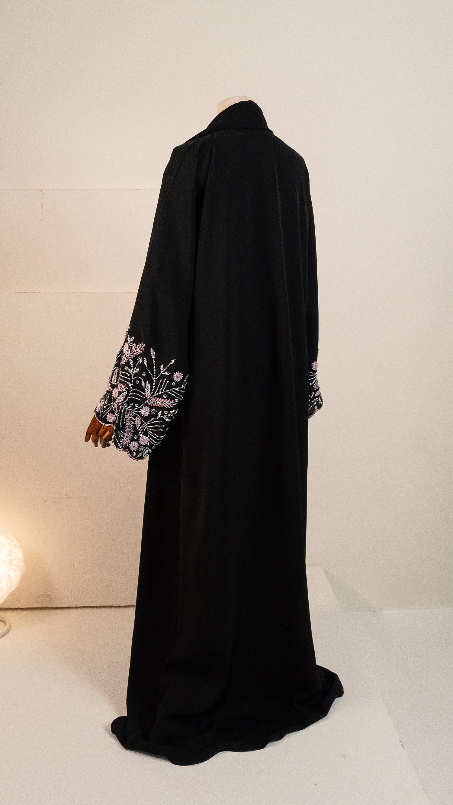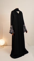 This abaya features a minimalist black silhouette elevated by intricate botanical embroidery on the cuffs, blending a clean, modern drape with a sophisticated flourish of soft pink and silver artistry and is suitable for both daily wear and special occasions.
