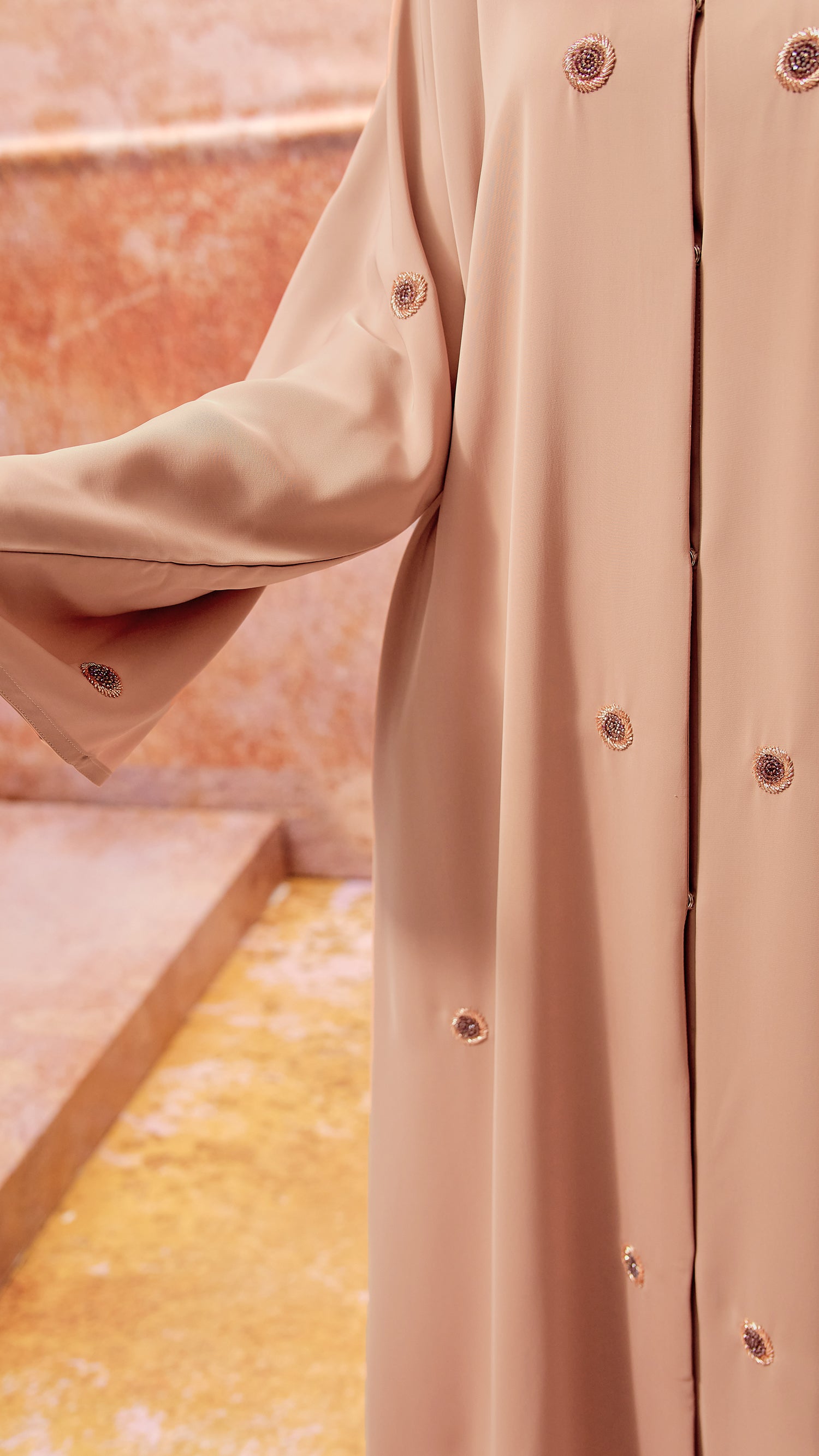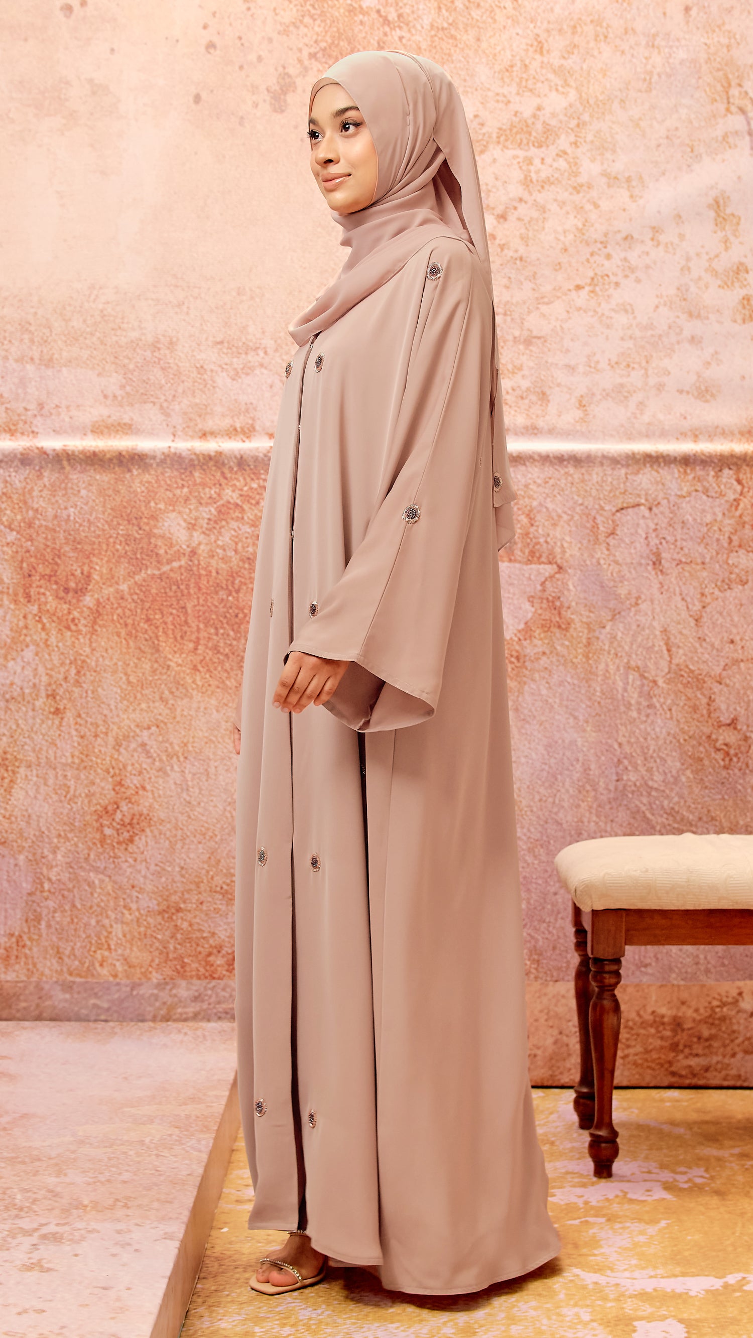 Abaya type: Front open style with fastening buttons. To make it front closed style, we can join the front slit. Please add to cart the alteration fee: Open-Closed type