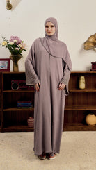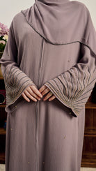 Our Suwar features heavy beadwork on the sleeves, arranged in curving, radiating lines that create a soft feather effect. Scattered beads across the abaya add a subtle, elegant sparkle, enhancing the warm brick orange tone. A striking yet refined piece that captures effortless beauty.