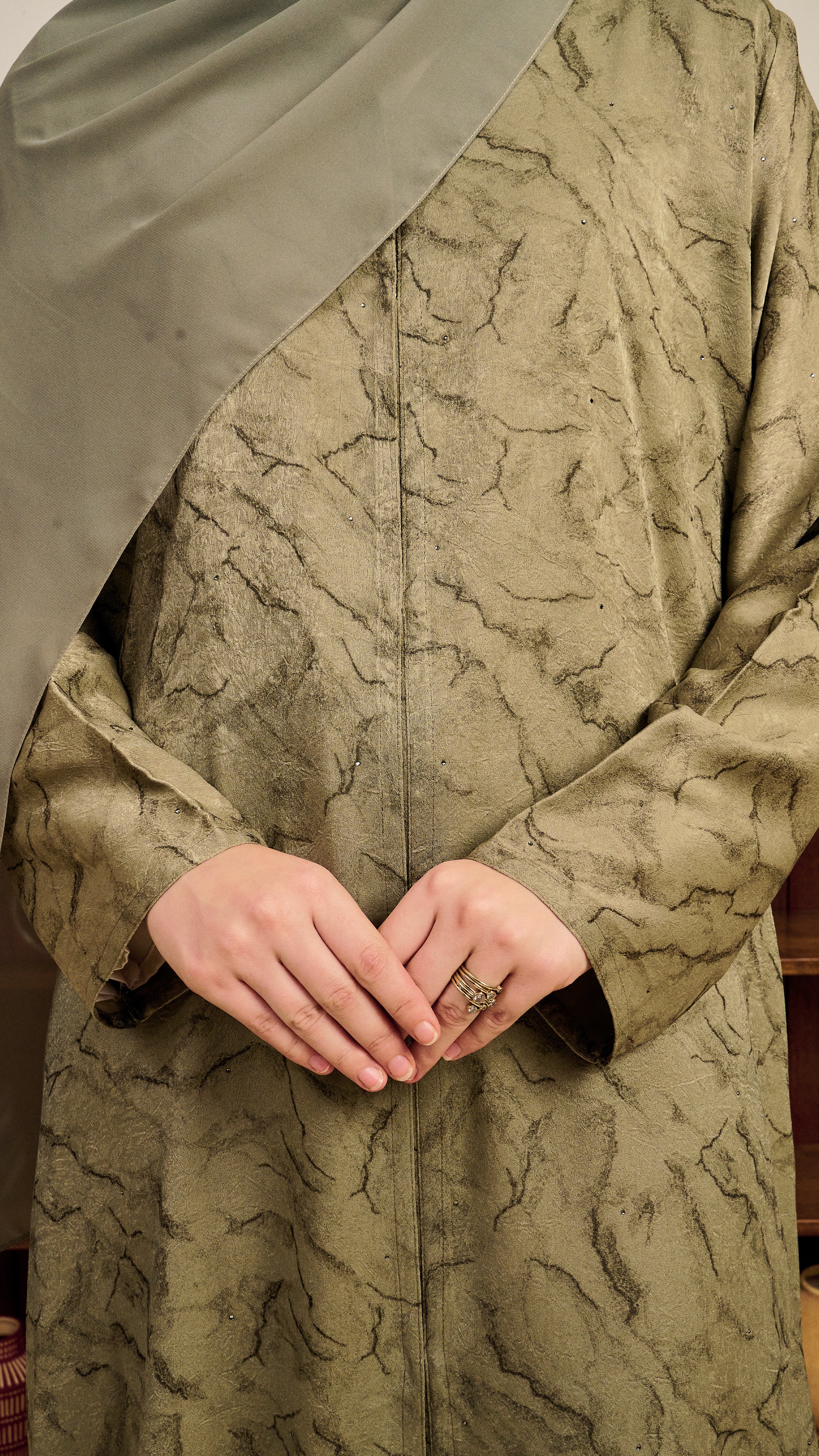 Mizhar features an organic, marble-like pattern that resembles natural cracks, spread evenly across the front and back. Scattered rhinestones add subtle sparkle, enhancing the textured, elegant and slightly mysterious look.