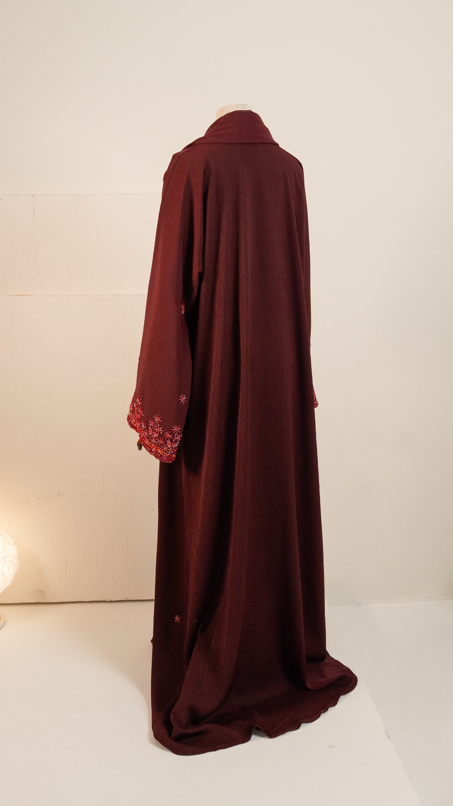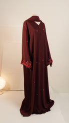 The abaya is detailed with small, delicate embroidered motifs scattered gently across the fabric. Subtle floral accents appear at intervals, creating a soft texture rather than a bold pattern. The restrained placement of embroidery adds depth and elegance, giving the abaya a timeless and polished finish suitable for formal or evening wear.