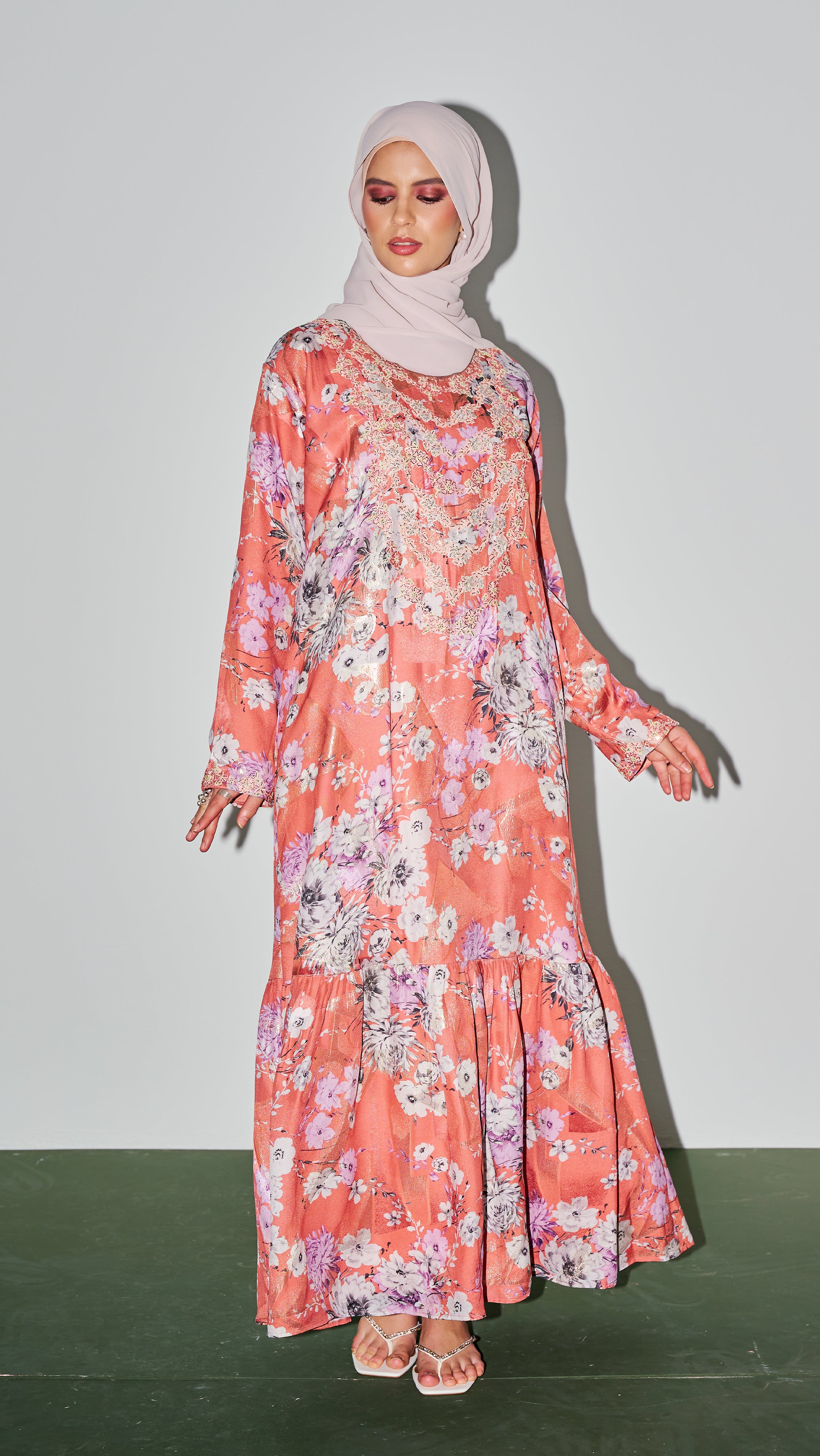 Jalabiya - Coral Red Based with Floral Patterns & Rhinestones