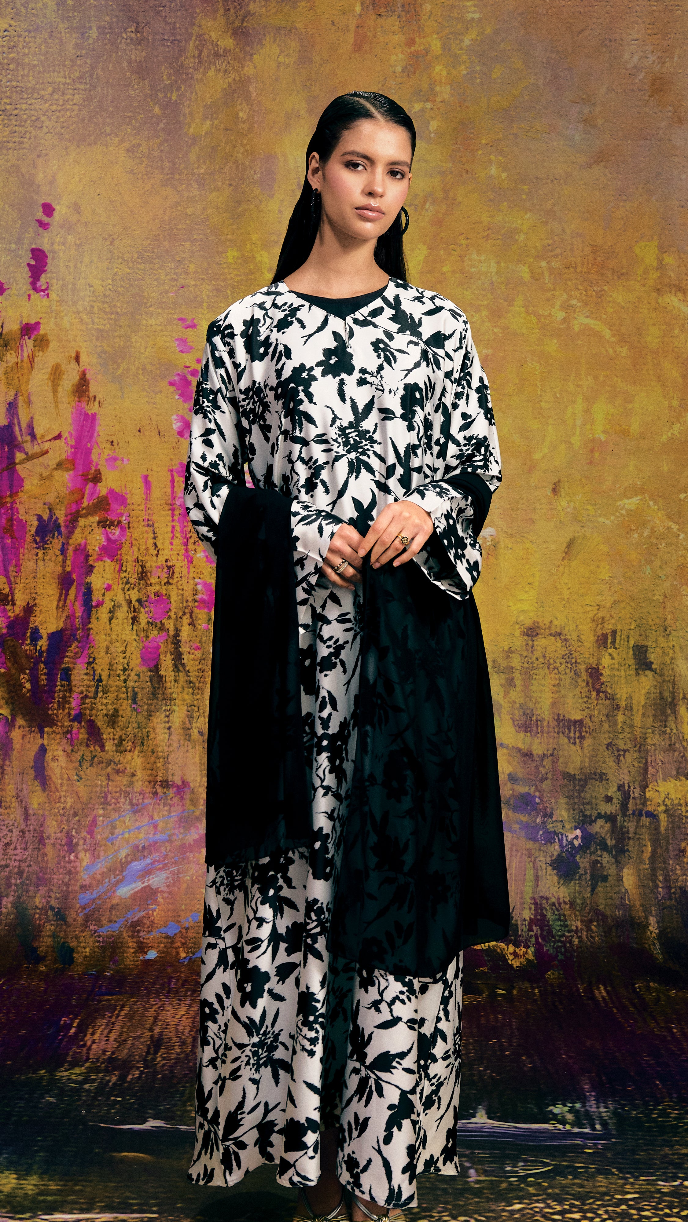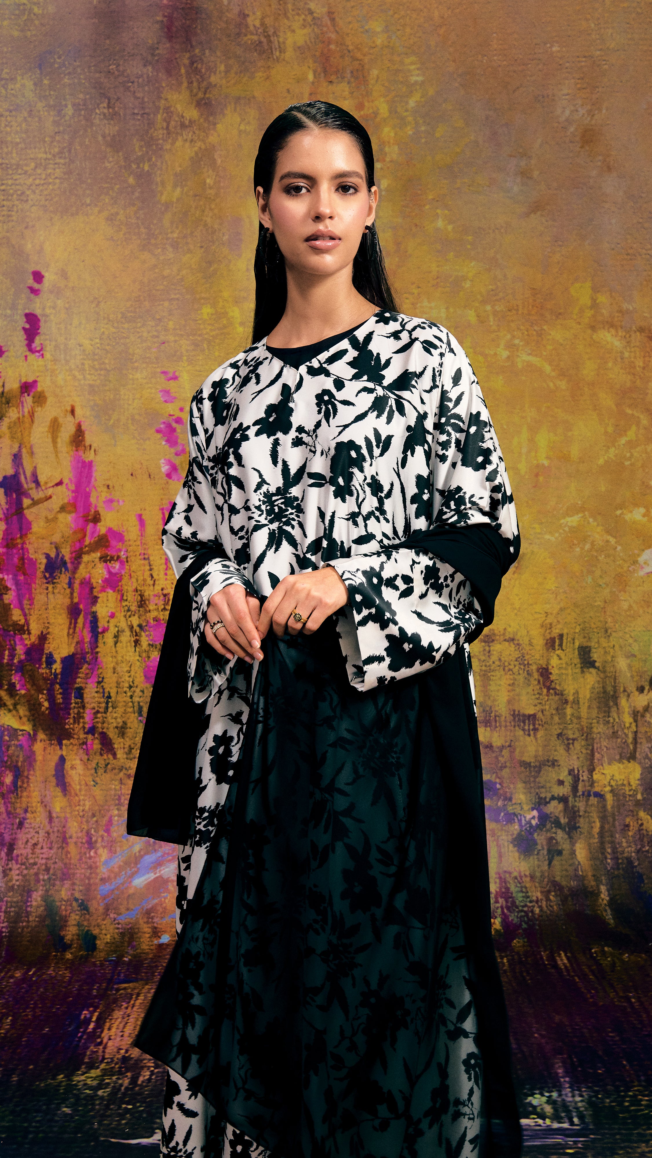 The Siwa Petal Black exudes graceful elegance, crafted from soft satin and adorned with a striking black floral pattern over a white base ideal for effortless summer sophistication.