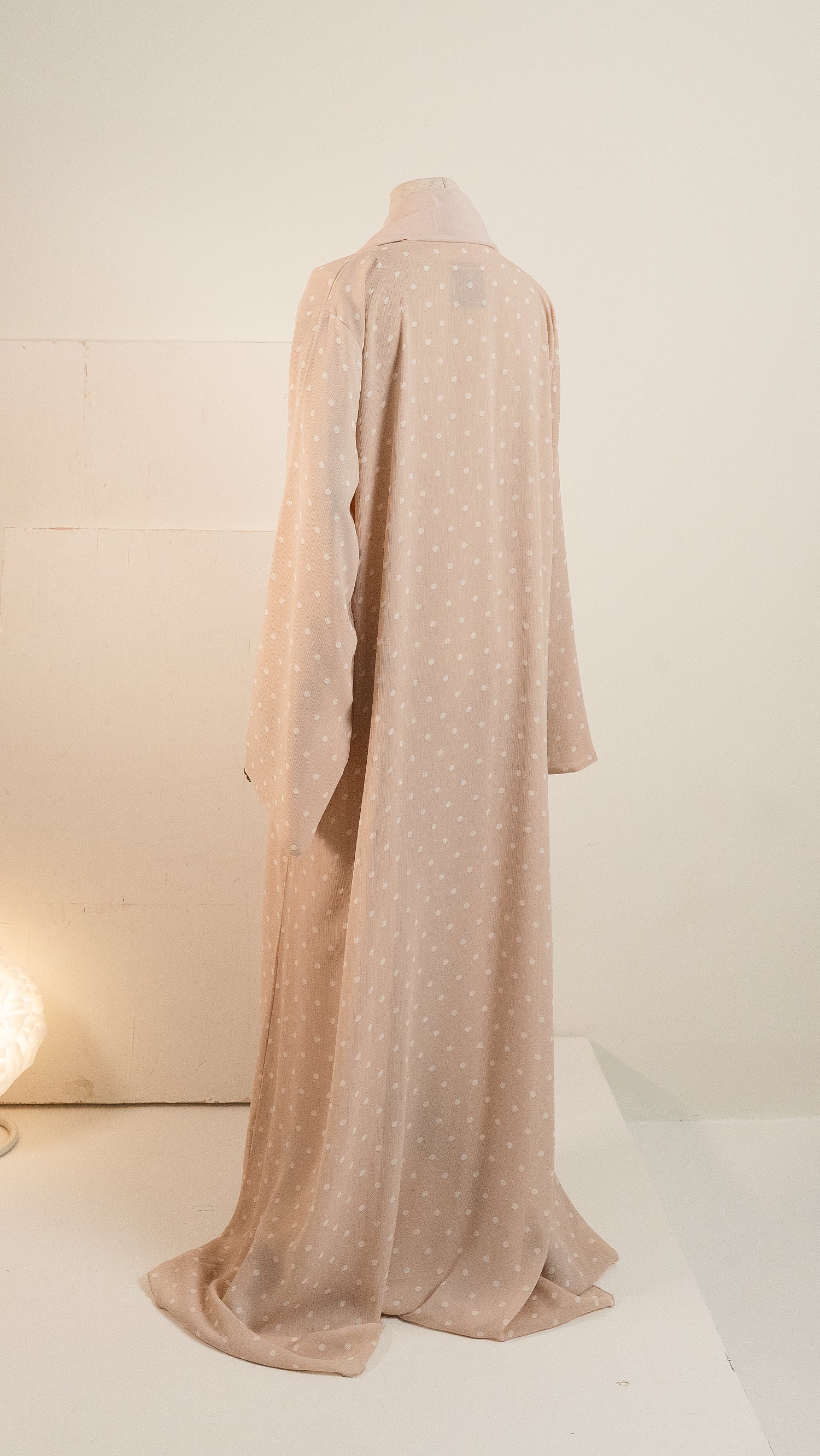 Yasa Abaya features a classic polka dot pattern with evenly spaced circular motifs across the fabric. The small dots create a balanced and structured design, adding subtle visual interest without overpowering the look. This timeless pattern brings a refined charm, giving the abaya an elegant and versatile appeal that works beautifully for both everyday wear and semi-formal occasions.