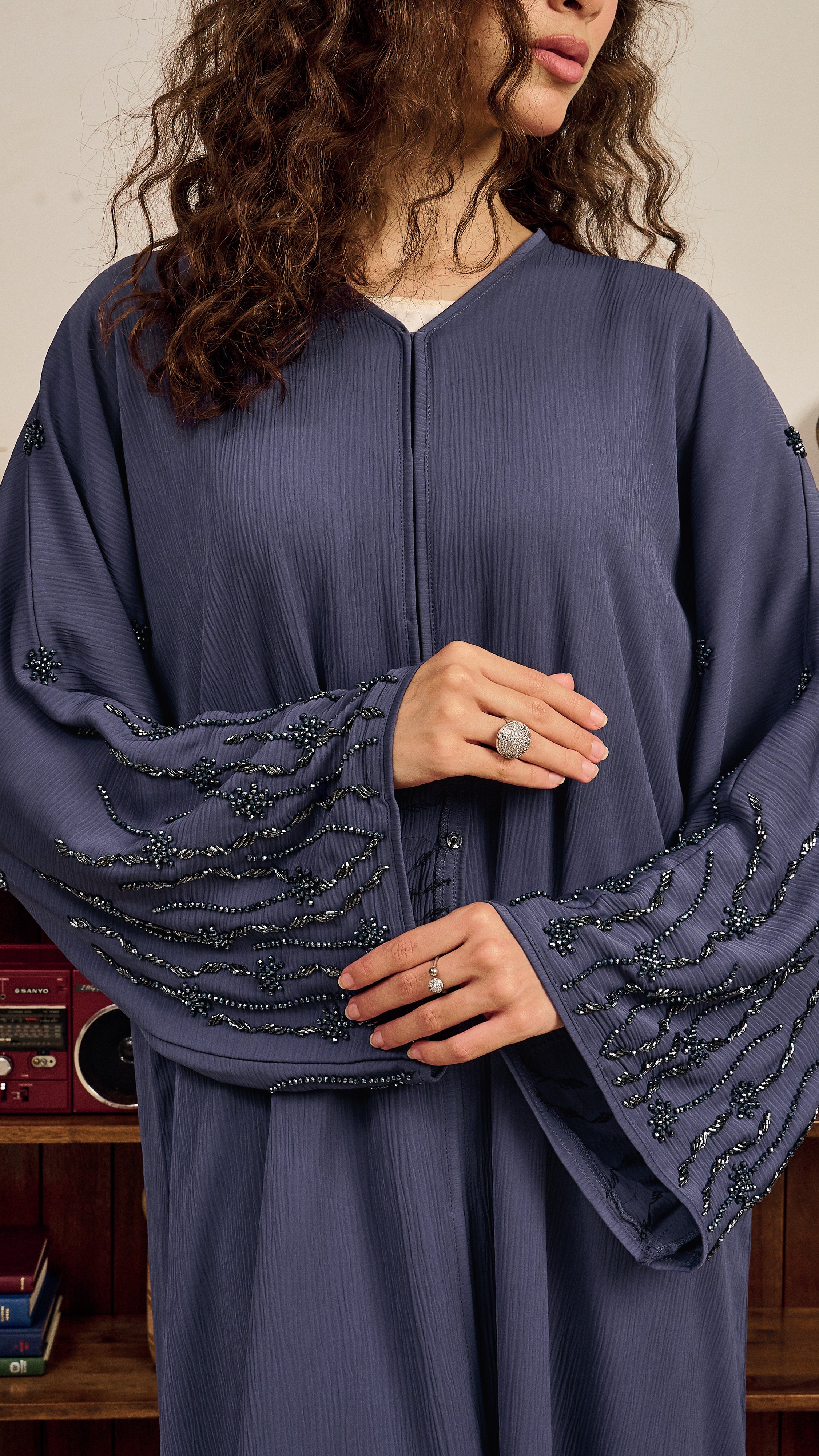 Our Ahwar showcases dense beadwork on the sleeves, featuring clusters of beads arranged like delicate flowers. Beaded lines extend outward in soft wave-like patterns, creating a graceful and elegant flow. A refined design that blends subtle detail with timeless charm.